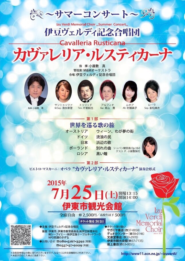 25日は伊豆ヴェルディ記念合唱団のサマーコンサートで、合唱曲とマスカーニのオペラ「カヴァレリア・ルスティカーナ」!大好きなオペラです!話はエグいけど(笑)なんて美しい曲なのかと演奏するたびに思います。